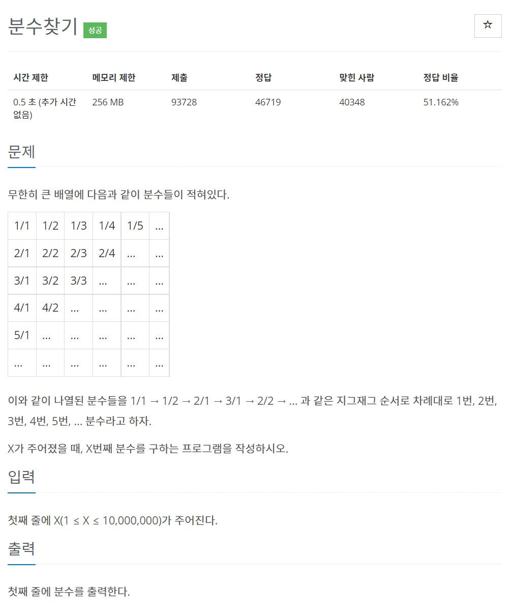 ※ 문제 풀이 코드는 맨 아래에 있습니다. 문제 무한히 큰 배열에 다음과 같이 분수들이 적혀있다. 1/1 1/2 1/3 1/4 1/5 … 2/1 2/2 2/3 2/4 … … 3/1 3/2 3/3 … … … 4/1 4/2 … … … … 5/1 … … … … … …