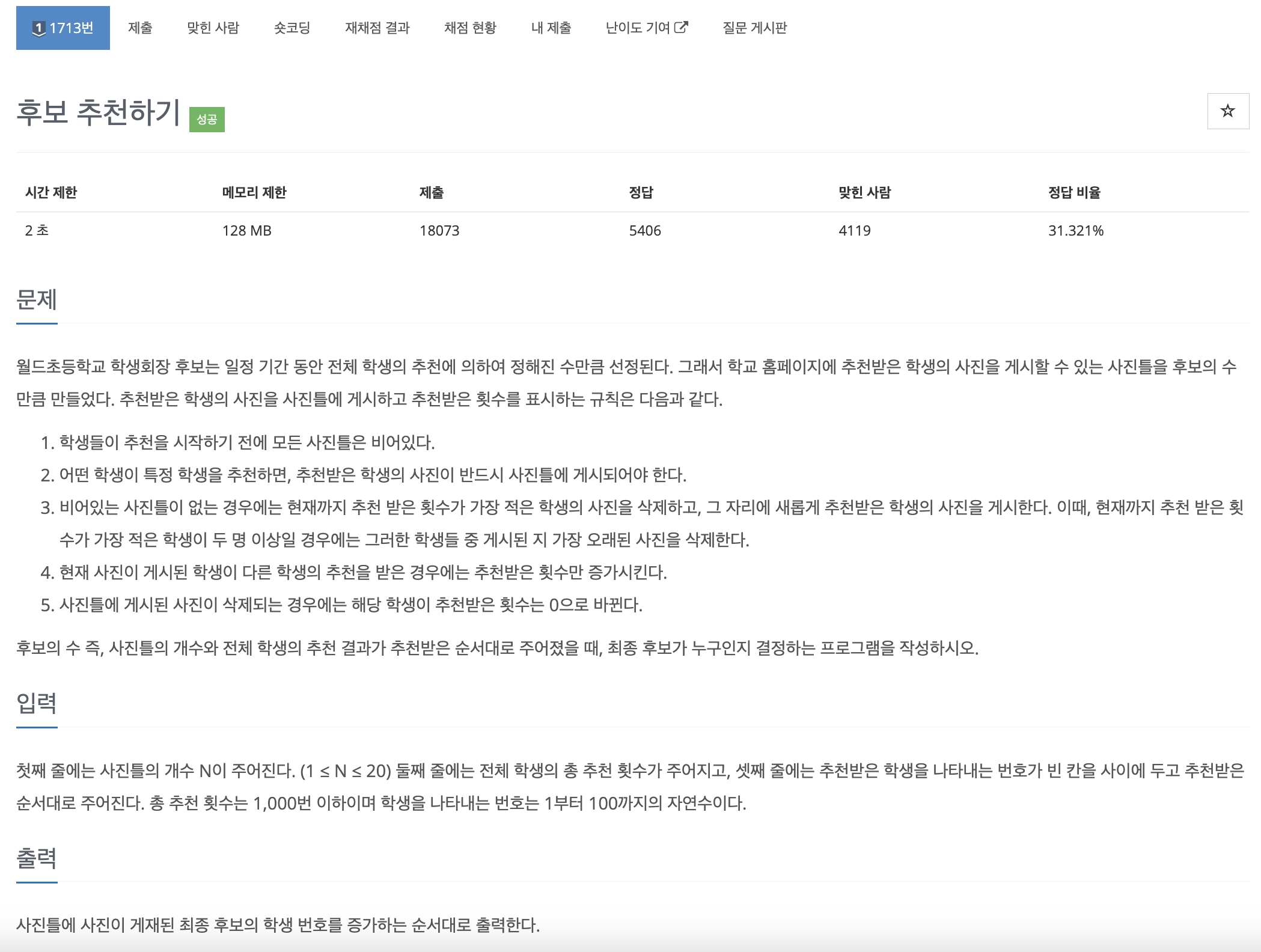 처음엔 문제를 잘못 읽어서 사진틀에 게시된 사진이 삭제되는 경우에도 추천횟수는 그대로 유지되고, 만약 다음에 또 사진틀에 게시될 경우 그 추천횟수에서 +1이 되는 줄 알고 사진틀에서 삭제된 후보의 추천 수는 어떻게 가지고 있지..?라는 생각을 하다가 시간을 낭비했다. 알고보니 사진틀에 게시된 사진이 삭제되는 경우에는 해당 학생이 추천받은 횟수는 0으로 바뀐다.