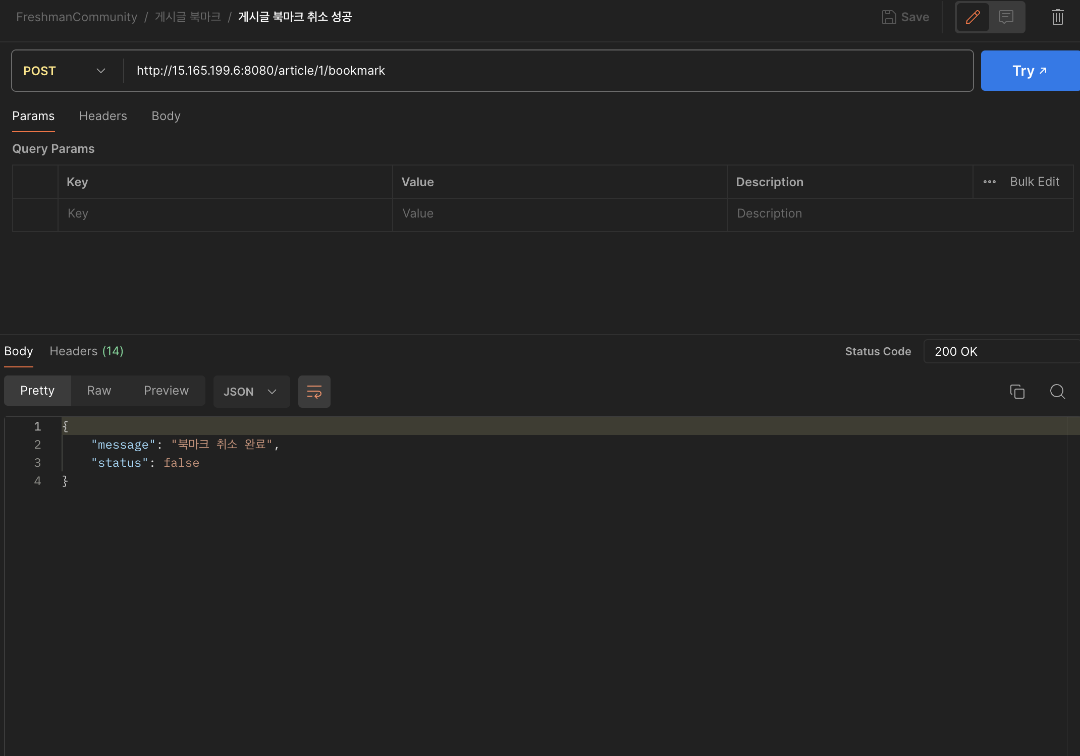 이미 북마크를 눌렀다면 북마크를 취소하는 것이므로 해당 게시글의 북마크 수를 1만큼 감소시켜주고, 북마크를 취소해준다.
