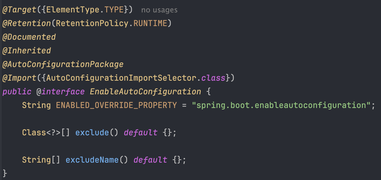 - @EnableAutoConfiguration은 Spring Boot의 자동 구성 매커니즘을 활성화한다. 이 어노테이션은 Spring Boot가 클래스패스에서 조건에 따라 Bean을 추가하고 다양한 설정을 자동으로 구성할 수 있게 해준다. @EnableAutoConfiguration은 내부적으로'AutoConfigurationImportSelector'를 사용하여 조건에 맞는 @Configuration 클래스들을 자동으로 등록한다. 예를 들어, spring-boot-starter-jpa가 클래스패스에 있으면 Spring Data JPA를 구성하는 Bean들이 자동으로 등록된다.