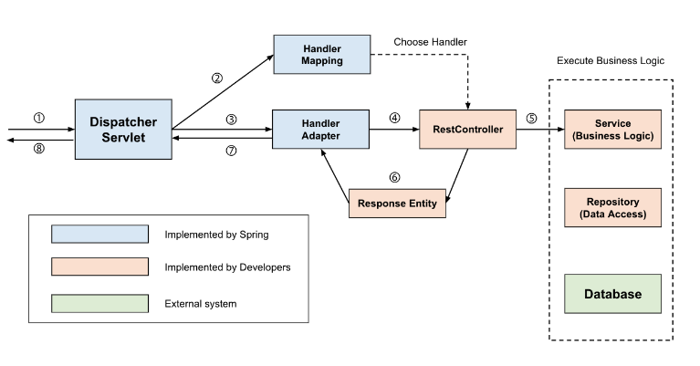 - Handler Adapter 호출: Handler Mapping이 결정한 핸들러를 실행하기 위해, Dispatcher Servlet은 해당 핸들러를 실행할 수 있는 Handler Adapter를 호출한다.