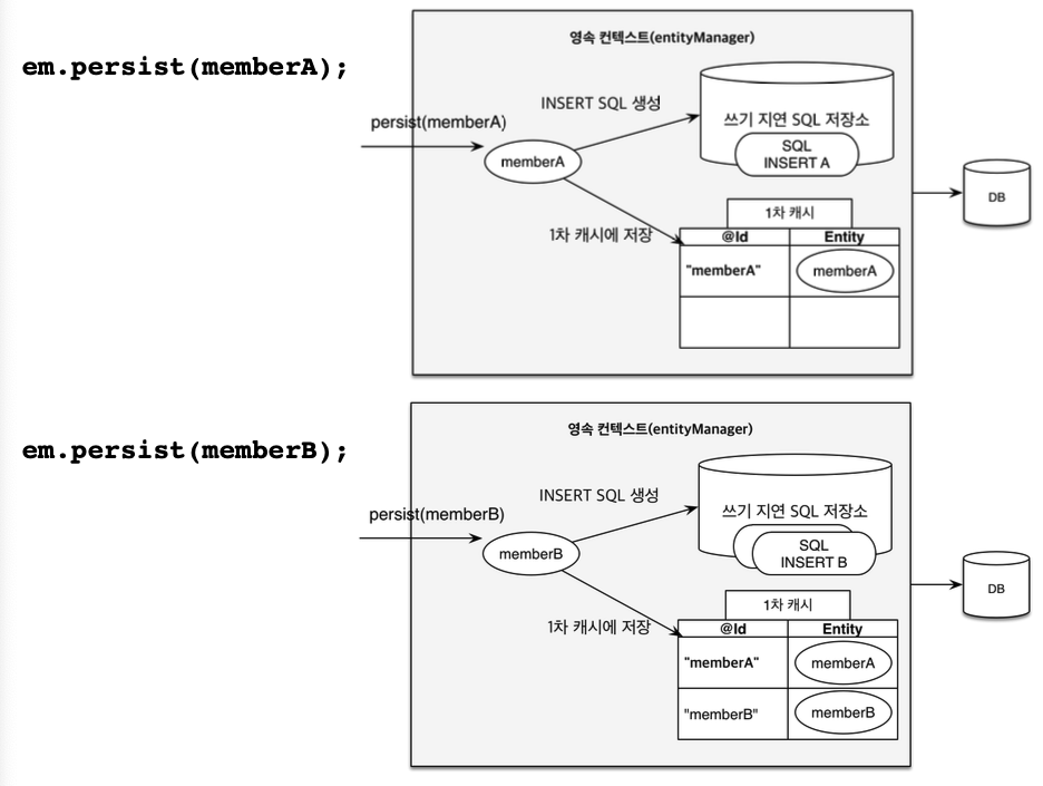 - ์์์ฑ ์ปจํ ์คํธ๋ 1์ฐจ ์บ์์ ํจ๊ป ์ฐ๊ธฐ ์ง์ฐ SQL ์ ์ฅ์๋ฅผ ๊ด๋ฆฌํ๋ค.