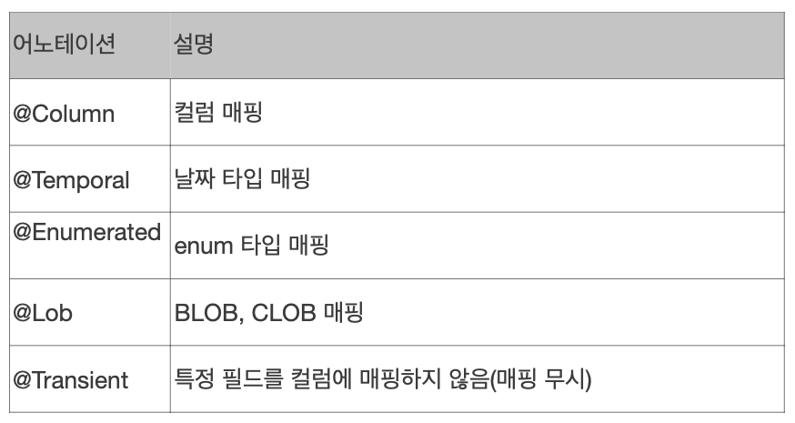 [SPRING]์๋ฐ ORM ํ์ค JPA ํ๋ก๊ทธ๋๋ฐ ์น์ 4 (์ํฐํฐ ๋งคํ)