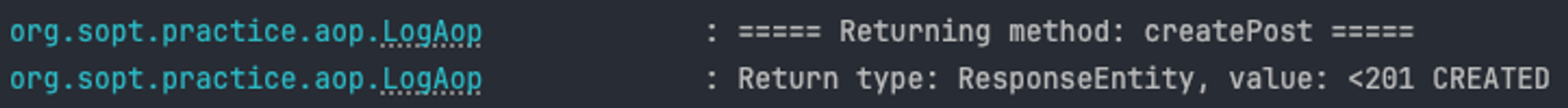 - 메소드가 예외 없이 성공적으로 결과를 반환한 후 실행된다. 이 어드바이스는 메소드의 반환 값을 처리하거나, 필요한 후처리를 수행할 때 사용된다.