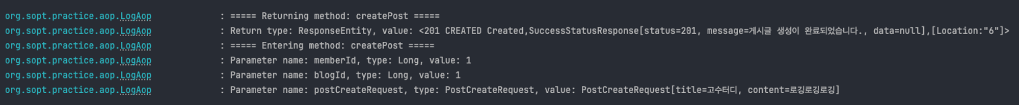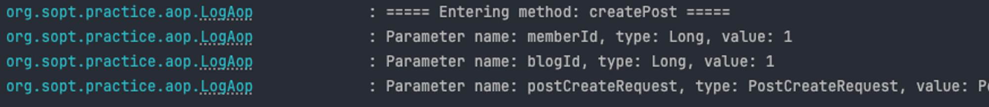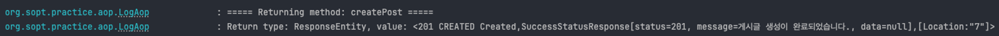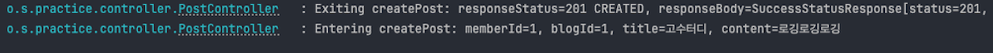 현재 **createPost**와 findPost 메서드 모두에서 메서드의 시작과 종료 시점에 로그를 기록하는 코드가 반복적으로 사용되고 있는데, 각 메서드에 로그 관련 코드를 추가하면 코드의 가독성과 관리가 어려워진다.