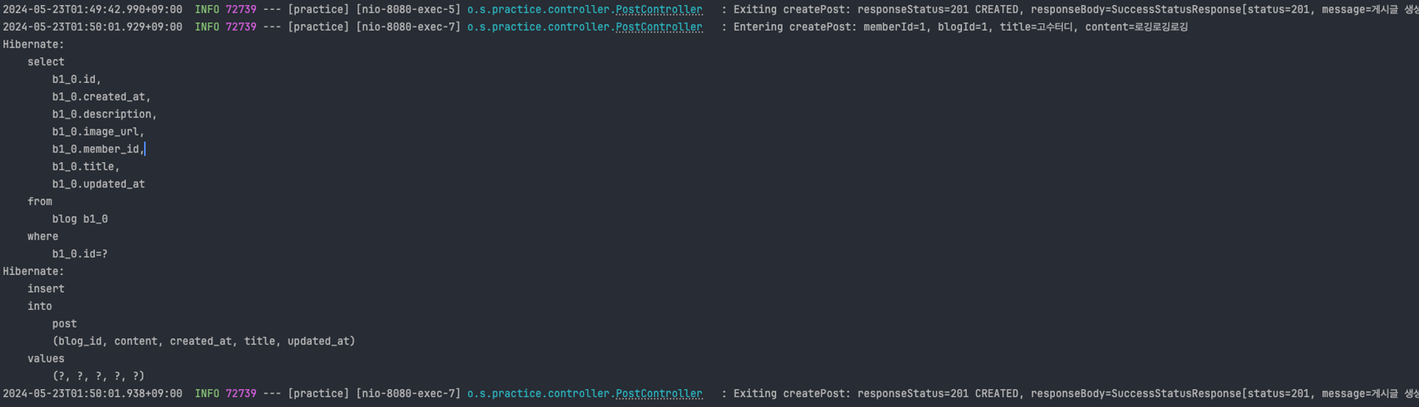 log.info("Entering createPost: memberId={}, blogId={}, title={}, content={}",