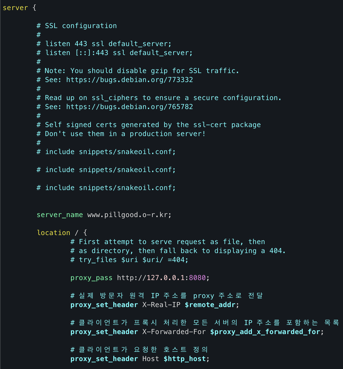 Nginx 설정 파일을 열어 도메인과 프록시 설정을 추가한다.