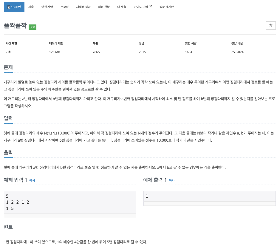 개구리가 일렬로 놓인 징검다리 사이를 배수 단위로 점프하면서 시작 지점 a에서 목표 지점 b까지 도달하는 최소 점프 횟수를 구하는 문제다.