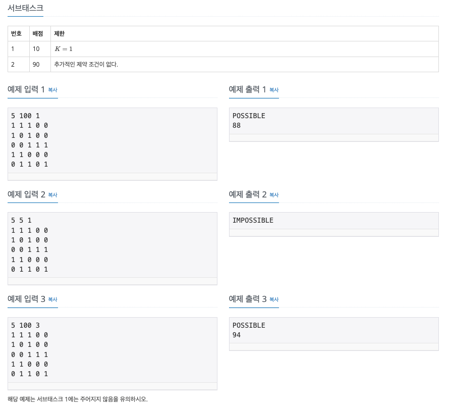 1차 시도에서는 0이 하나도 없는 상황(모든 칸이 1)일 때도 result = 0으로 계산되면서 결과가 POSSIBLE로 출력되는 문제가 있었다.