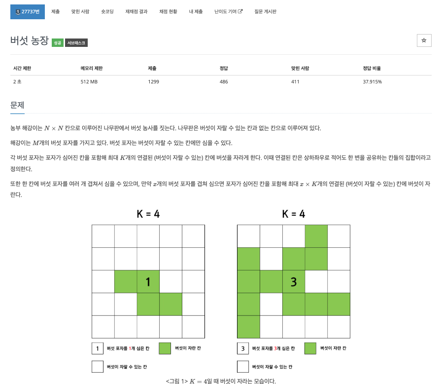 이번 문제인 버섯 농장은 N×N 크기의 나무판에서, 버섯이 자랄 수 있는 칸(0)에 버섯 포자를 심어서 모든 버섯 가능 칸을 덮는 문제이다.