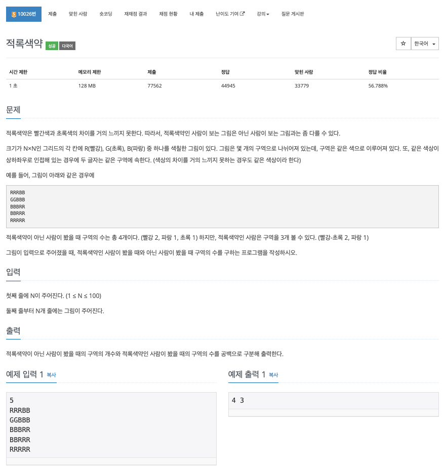 이번 문제인 적록색약 문제는 N×N 크기의 그리드에서 일반인과 적록색약이 각각 보는 색상의 구역 수를 계산하는 문제이다. 이 문제에는 다음과 같은 조건이 있다.