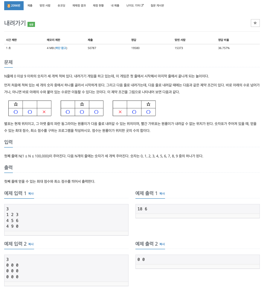 내려가기 성공 문제는 N줄에 0 이상 9 이하의 숫자가 세 개씩 주어진 배열에서 첫 줄에서 시작해 마지막 줄까지 내려가며 얻을 수 있는 최대 점수와 최소 점수를 구하는 문제다.