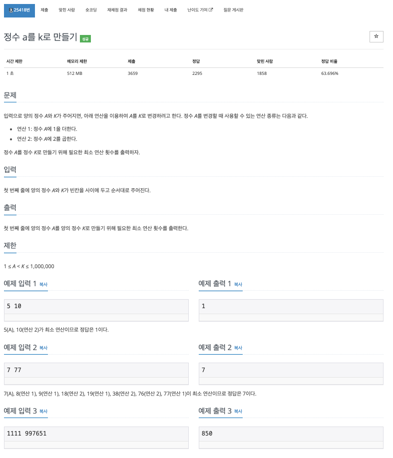 양의 정수 A에서 로 변경하는 최소 연산 횟수를 구하는 문제입니다.