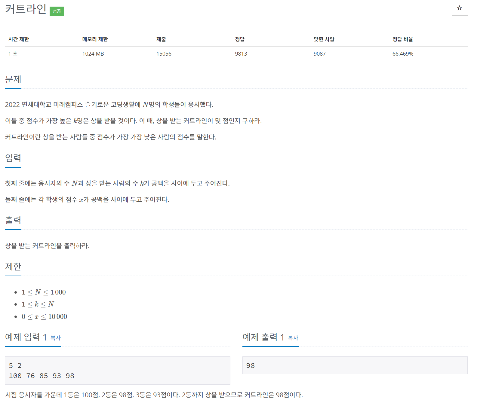 삽입정렬로 입력받은 점수들을 작은 수부터 차례대로 정렬을 해준 다음에, N-k로 커트라인에 걸친 점수가 출력되도록 하였다.