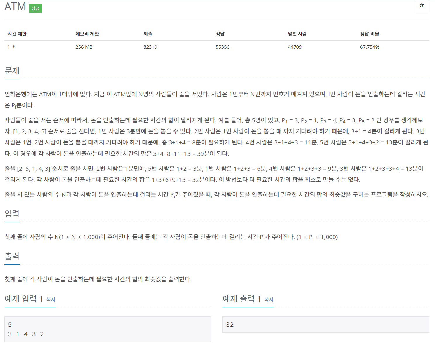 생각하는데 시간이 좀 걸렸던 문제다. 단순히 입력한 값의 합을 구하는 것이 아니라, 계속해서 뒷사람으로 갈수록 더 걸리는 시간들의 누적합을 구하는 것이라 다소 까다로웠다.