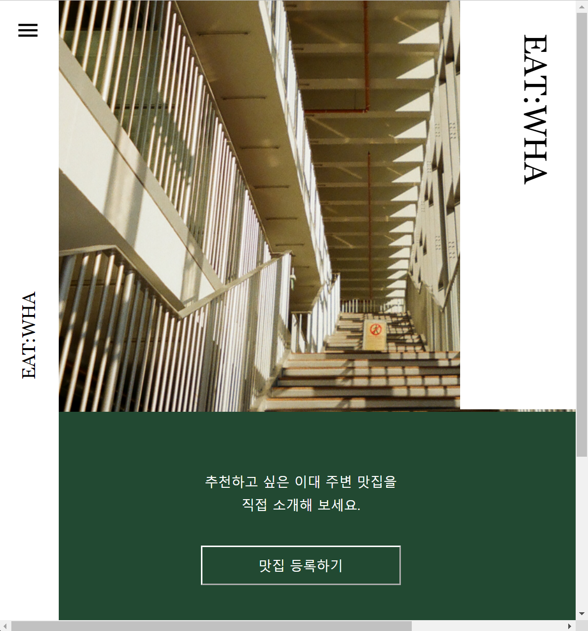 위의 미디어 쿼리를 적용한 예로, 학교 프로젝트 팀에서 개발한 맛집어플리케이션 웹의 홈 화면이 있다.