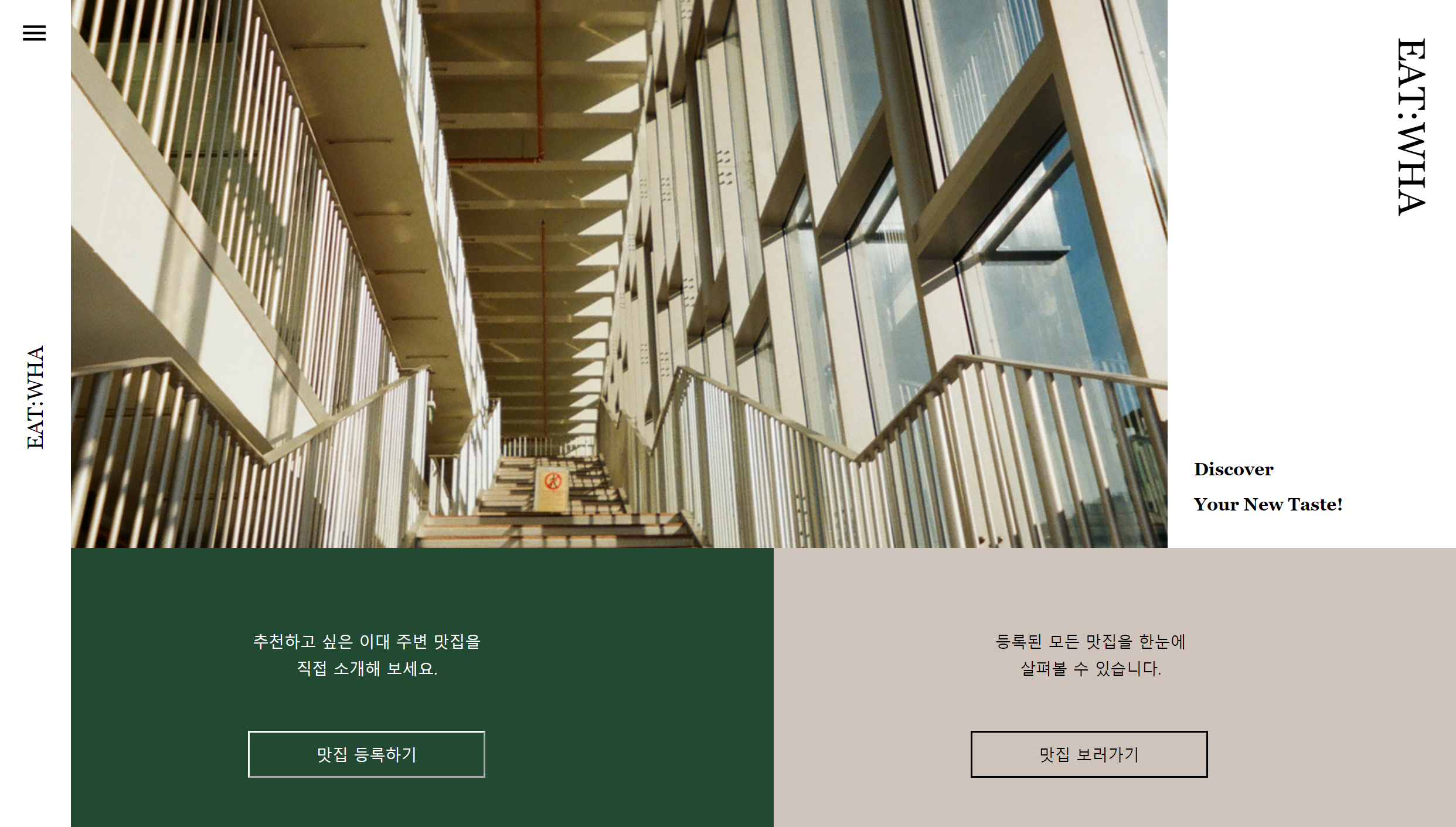 웹을 실행했을 때 기본적으로 나타나는 전체 기본 화면이다. 맛집 등록하기 섹션과 맛집 보러가기 섹션이 양 옆으로 나열되어있는 것을 확인할 수 있고, discover your new taste! 라는 문구도 보이는 상태이다.