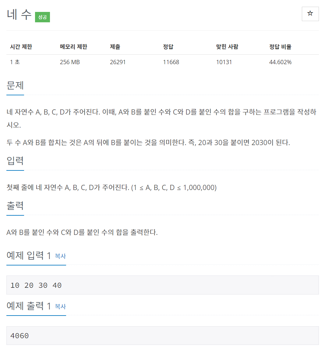 AB = int(str(num)+str(num2)) #문자열은 더하면 A+B=AB