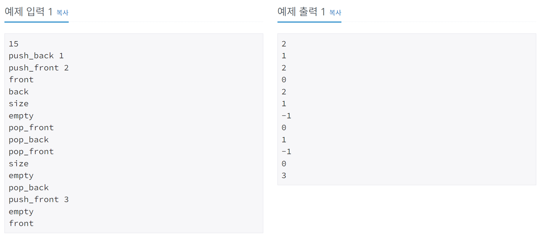 push_back X 로 정수 X를 받으면 공백 단위로 split 시켜 리스트에 push_back, X(정수)를 따로 넣어주고, list[0]의 값이 뭐냐에 따라 if, else 문을 작성해주었다. 이렇게 하면 특이한 케이스인 push_back X와 push_front X에서 X의 값이 list[1]에 저장되어 있기 때문에 list[1] 즉, 원하는 정수를 덱의 앞뒤에 넣어줄 수 있다.