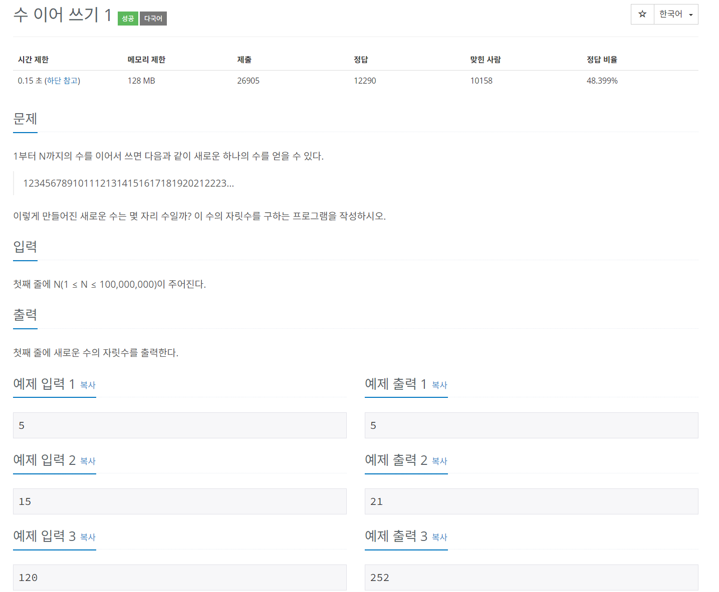 그리고 아직 더하지 않은 남은 25개는 3자리 숫자들이므로 length = length + (num - 10**(n-1) + 1) * n = 25*3을 해준다.