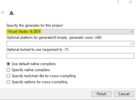 그런 다음 configure버튼을 누르면 visual studio 버전을 선택하는 란이 나올텐데, 내 visual studio는 2022 버전이라 2022 버전을 선택해주었다. 그 밑에는 x64를 선택해주었고, 나머지는 원래 상태로 두었다.