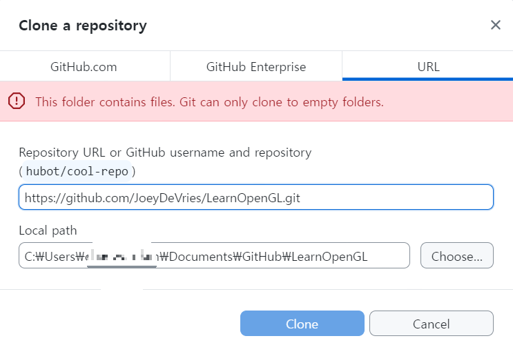아까 복사한 주소를 붙여넣기 해주고, Local path를 설정해준 다음 clone 버튼을 눌러 clone 시켜준다.