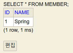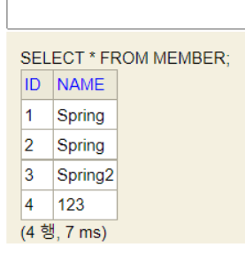 INSERT INTO MEMBER(NAME) VALUES('Spring')insert ๋ช ๋ น์ด๋ก member ํ ์ด๋ธ์ ๊ฐ์ ์ถ๊ฐํ๋ฉด,