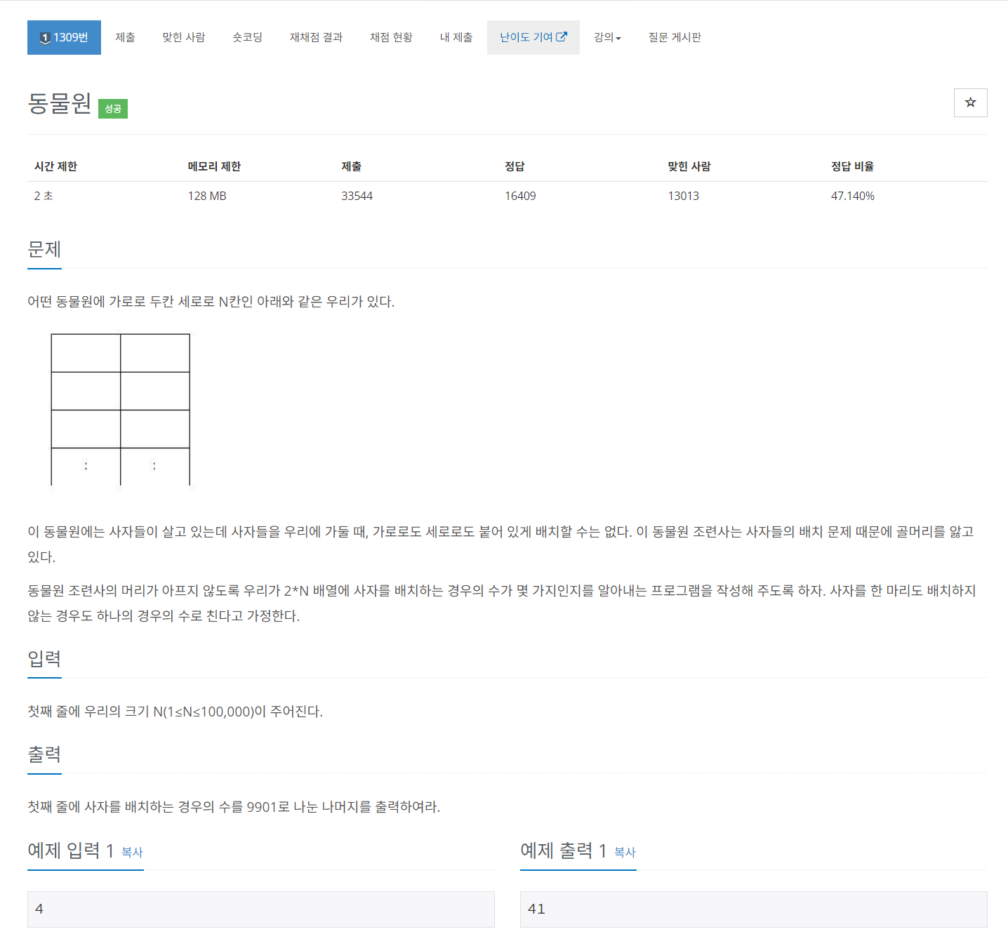 결국 1.N번째 줄에 사자가 없는 경우 (X X) 2.N번째 줄 왼쪽에 사자가 있는 경우(O X) 3.N번째 줄 오른쪽에 사자가 있는 경우(X O) 이렇게 3가지의 경우의 수로 나누어 풀면 되는 문제였다.