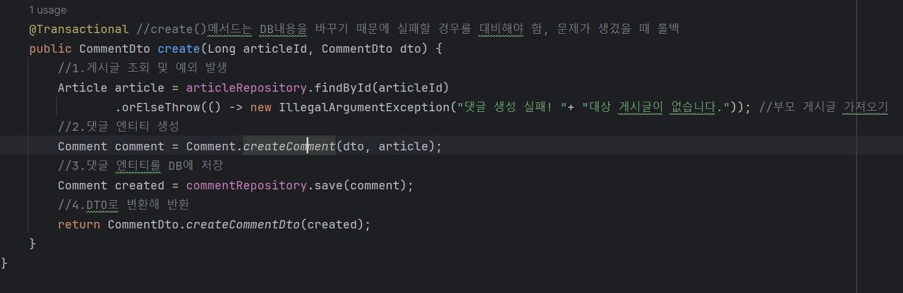 왜 댓글 DTO를 엔티티로 만들 때는 <entity/Comment 클래스>에서 새로운 메서드를 만들어서 하지?라는 의문이 들었다. 왜 이 둘의 방법을 다르게 하는 걸까? 특별한 이유가 있을까??