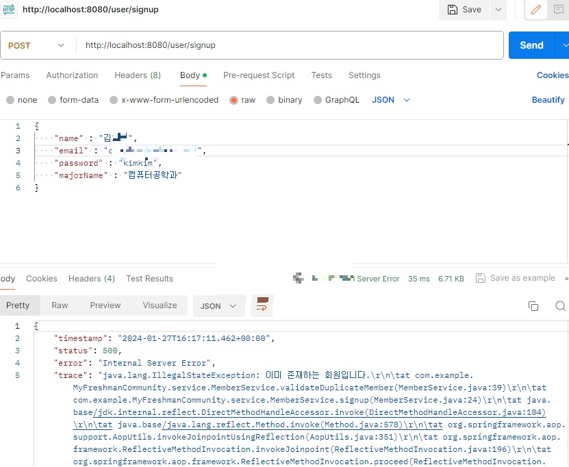 실제로 postman에서 확인해보면 trace로 길게 리턴되어 프론트엔드 단에서 trace 의 string 메시지 (예. 이미 존재하는 회원입니다 라는 데이터)를 확인하기 쉽지 않다. 또한 status 에러가 500으로 뜨는 데 이 경우엔 프론트엔드에서 구체적으로 어떤 에러인지 확인하기 쉽지 않다. 따라서 이왕이면 custom 으로 Exception 을 핸들링해주는 것이 좋다.