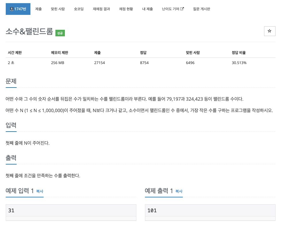 소수와 팰린드롬 두가지 경우를 모두 만족해야 하는 문제이다.