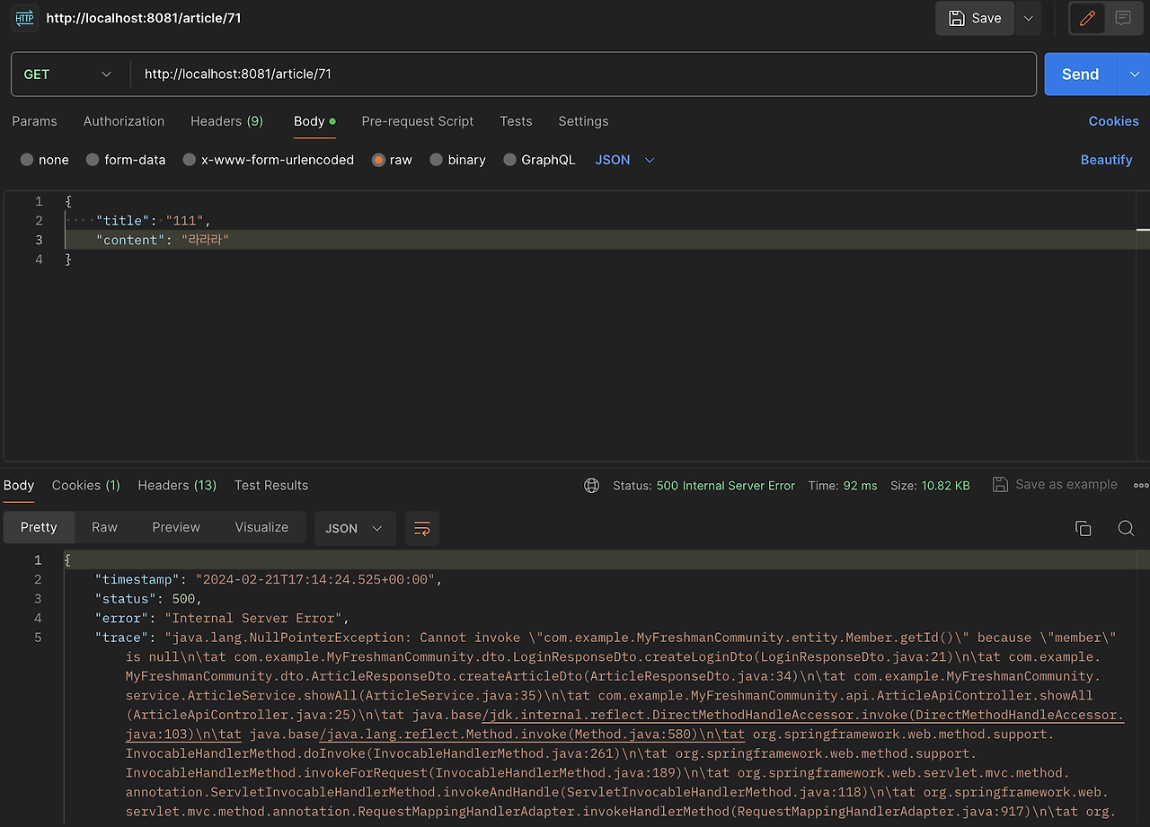 이 상황에서 발생한 NullPointerException 오류는 게시글을 조회하는 과정에서 해당 게시글을 작성한 회원의 정보를 참조하려고 했으나, 회원 정보가 이미 'null'로 설정되어 있기 때문에 발생한 것이다. 즉 회원 정보가 'null'이 될 수 있다는 점을 체크하지 않고 회원 정보가 있을 때만을 고려하여 (null이 아닐 때만을 고려하여) 코드 구현을 했기 때문이다..!!