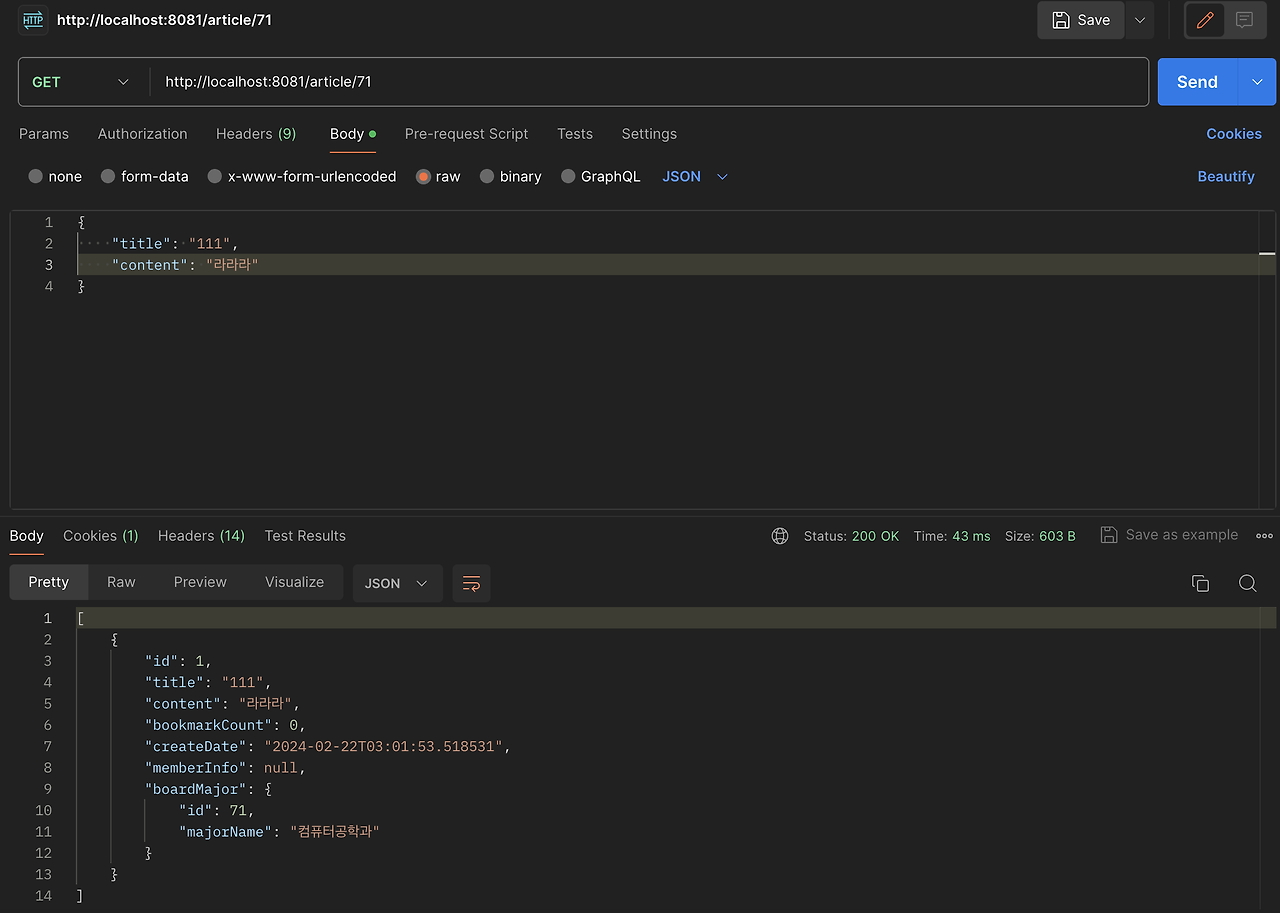 다시 포스트맨으로 게시글 조회를 해보면, 회원이 탈퇴해도 NullPointerException 오류가 발생하지 않고 null로 잘 뜨는걸 확인할 수 있다!!