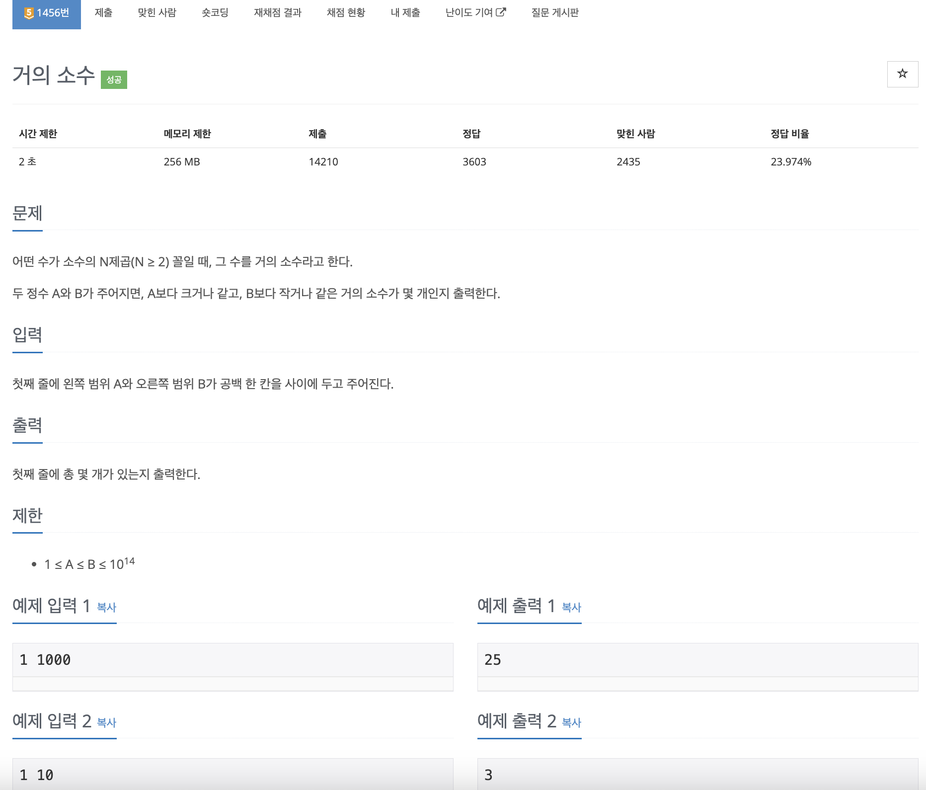 소수를 찾는 문제이므로, 아리스토테네스의 체를 이용하면 된다. 아리스토테네스의 체를 통해 찾은 소수를 바탕으로, 소수의 제곱부터 시작하여 'B' 이하의 모든 소수의 거듭제곱 값을 계산하여 이 값이 'A' 이상이면 해당 수를 "거의 소수"로 간주하면 된다.