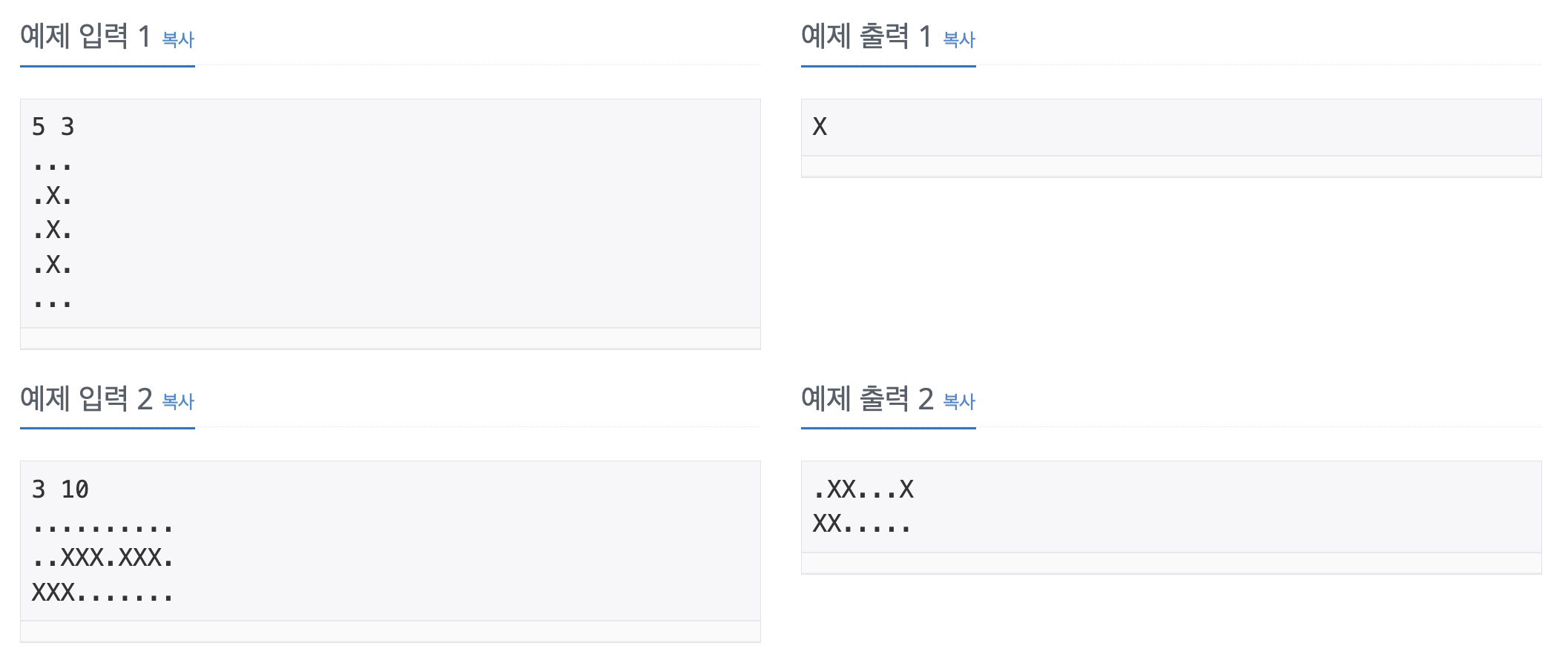 - 최소 및 최대 x, y 좌표 찾기: 'X'가 있는 칸을 순회하며, 이 칸들의 최소 및 최대 x, y 좌표를 찾는다. 이를 통해 최소 직사각형 영역의 경계를 결정할 수 있다.