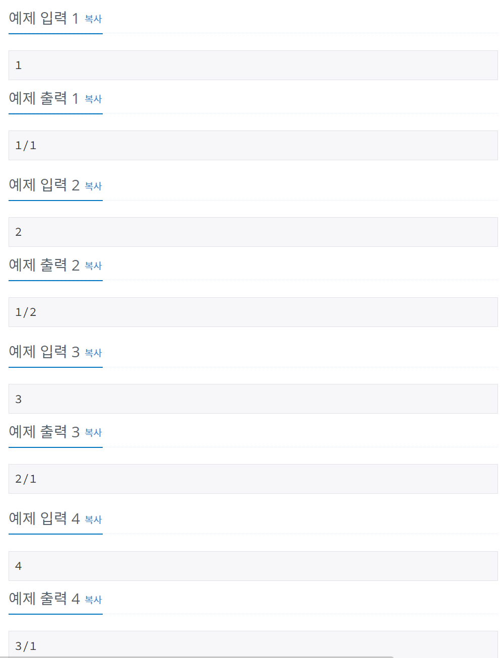 ※ 문제 풀이 코드는 맨 아래에 있습니다. 문제 무한히 큰 배열에 다음과 같이 분수들이 적혀있다. 1/1 1/2 1/3 1/4 1/5 … 2/1 2/2 2/3 2/4 … … 3/1 3/2 3/3 … … … 4/1 4/2 … … … … 5/1 … … … … … …