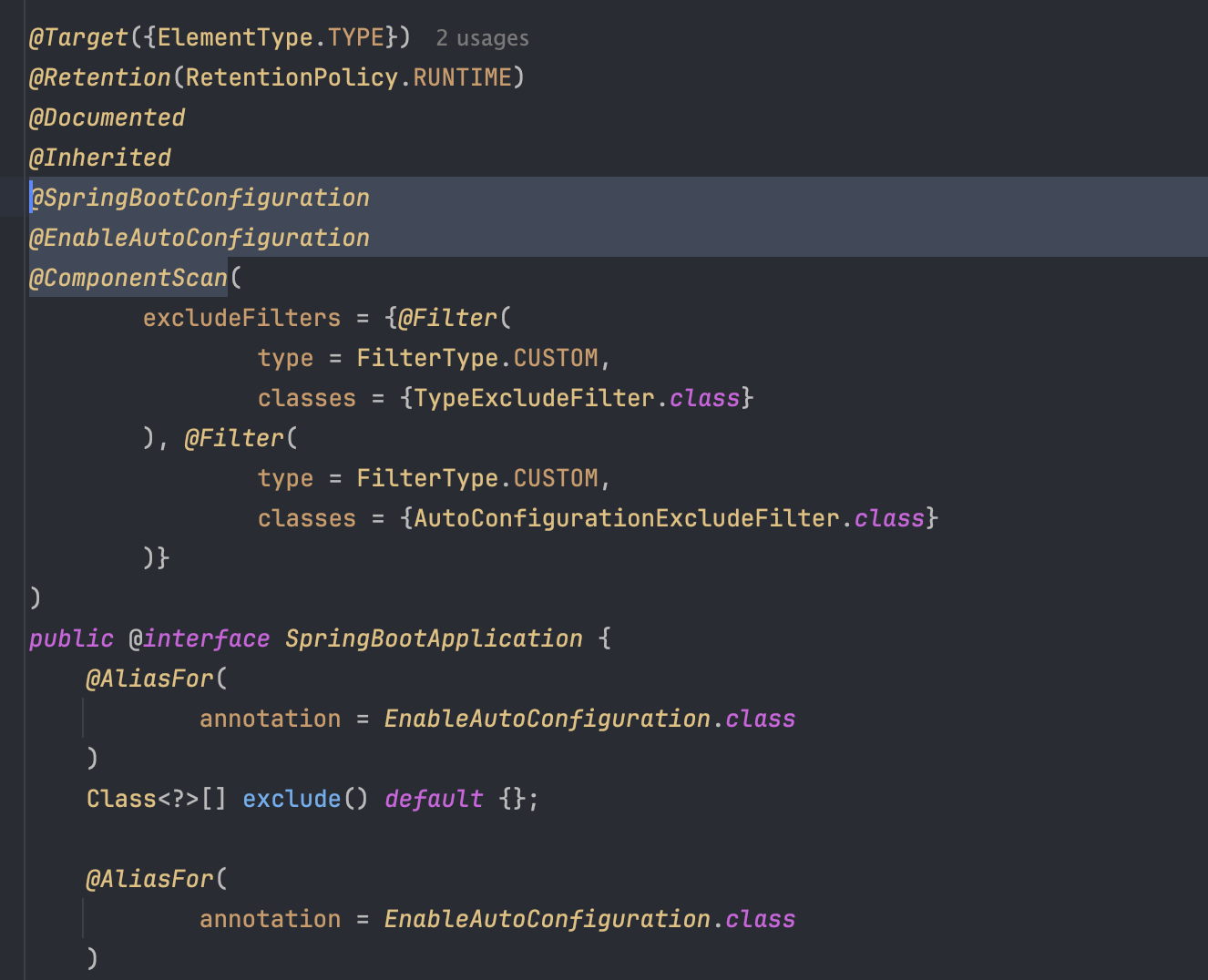 사진과 같이 @SpringBootApplication은 어노테이션은 '@SpringBootConfiguration', '@EnableAutoConfiguration', '@ComponentScan'을 포함하고 있다.