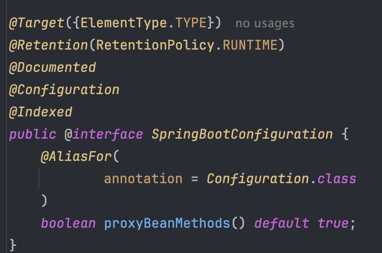 - @SpringBootConfiguration은 Spring의 @Configuration을 더 구체화한 것으로, Spring Boot 애플리케이션의 설정을 정의하는 클래스임을 나타낸다. @Configuration 어노테이션이 붙은 클래스는 스프링 컨테이너에 의해 Bean 정의들을 등록하는 데 사용된다.