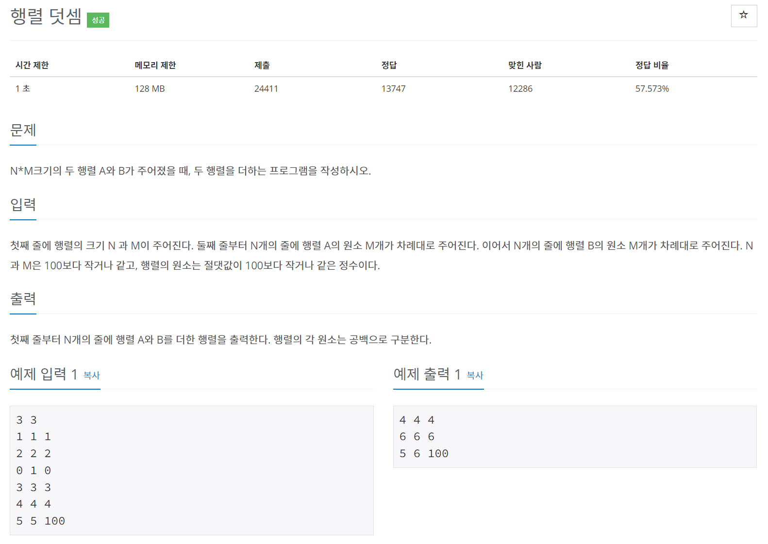 처음 반복문에서 행렬을 0으로 초기화해주고 (이 부분은 없어도 상관 없는 것 같다.) 두번째 반복문에서 각각의 행렬 칸에 입력한 값들을 더해주고, 세번째 반복문에서 행렬에 있는 값들을 다 출력해주면 끝!