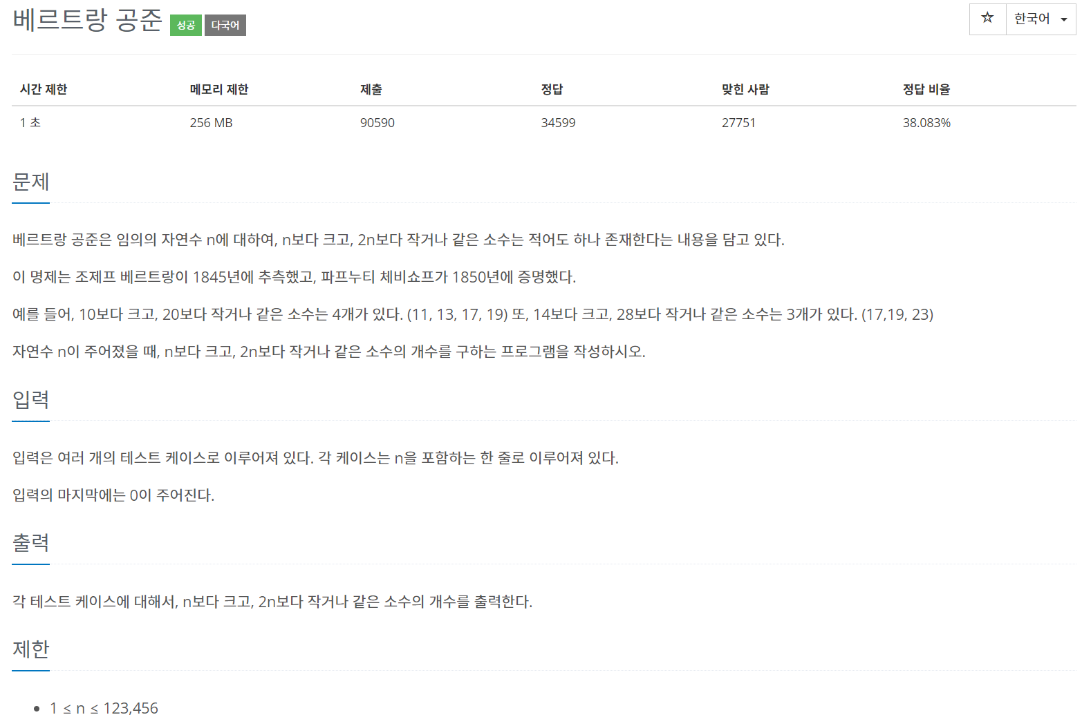 문제 이름이 되게 있어보인다. 베르트랑 공준.ㅎㅎ 지금까지 소수문제를 많이 풀어봤기에 이것도 비슷하겠거니 하고 코드를 작성했다.