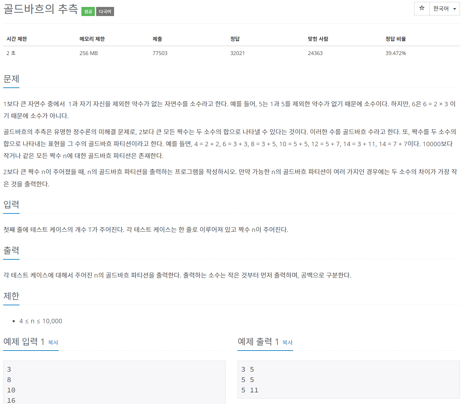 골드바흐의 추측 문제..! 백준을 풀면서 한 번도 들어보지 못했던 ~~의 정리, ~~의 추측 등 새로운 수학의 법칙(?)들을 많이 접하는 것 같다.