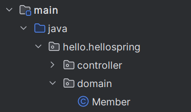 main/java/hello.hellospring ํด๋์ domain ํจํค์ง ์ถ๊ฐ, ๊ทธ ์์ Member๋ผ๋ ํด๋์ค๋ฅผ ๋ง๋ค์ด์ฃผ์๋ค.