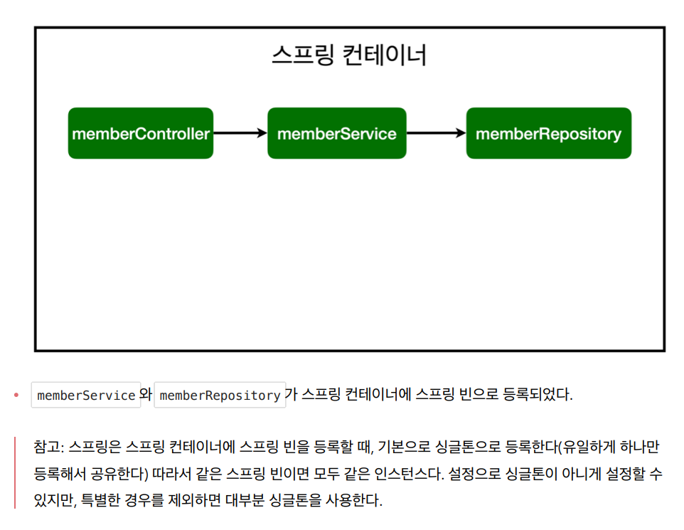 이제 스프링 컨테이너에 스프링 빈으로 등록이 되었고, 서로 의존관계를 가지게 되었다.