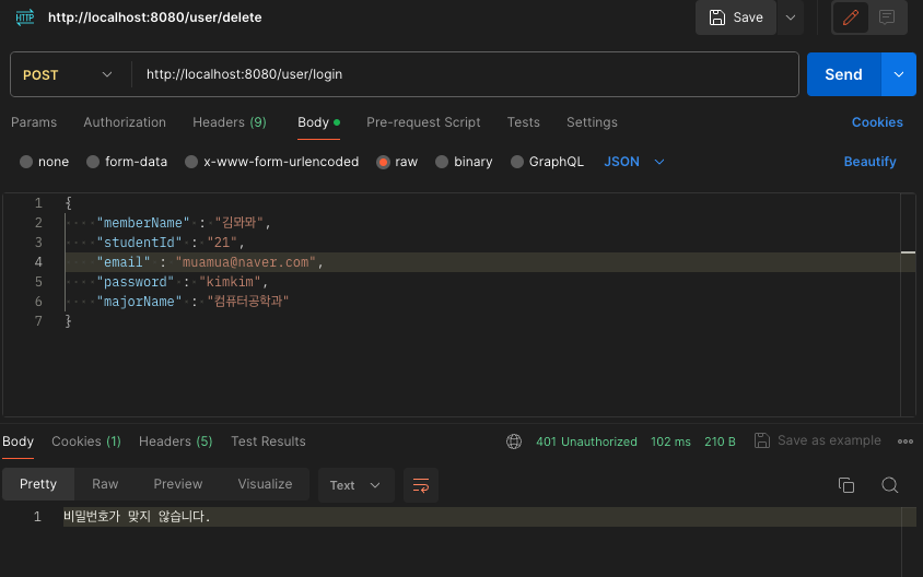 로그인에서는 가입된 이메일이 아닌 경우엔 "존재하지 않는 회원입니다"를, 비밀번호가 틀린 경우에는 "비밀번호가 맞지 않습니다"라는 에러 메시지를 반환해주도록 했다.